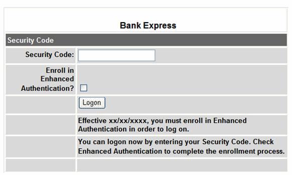 Enter your regular Security Code on the new Security Code screen. You can log in to your Internet banking or bill payment site as usual, or you can enroll in Enhanced Authentication immediately. |